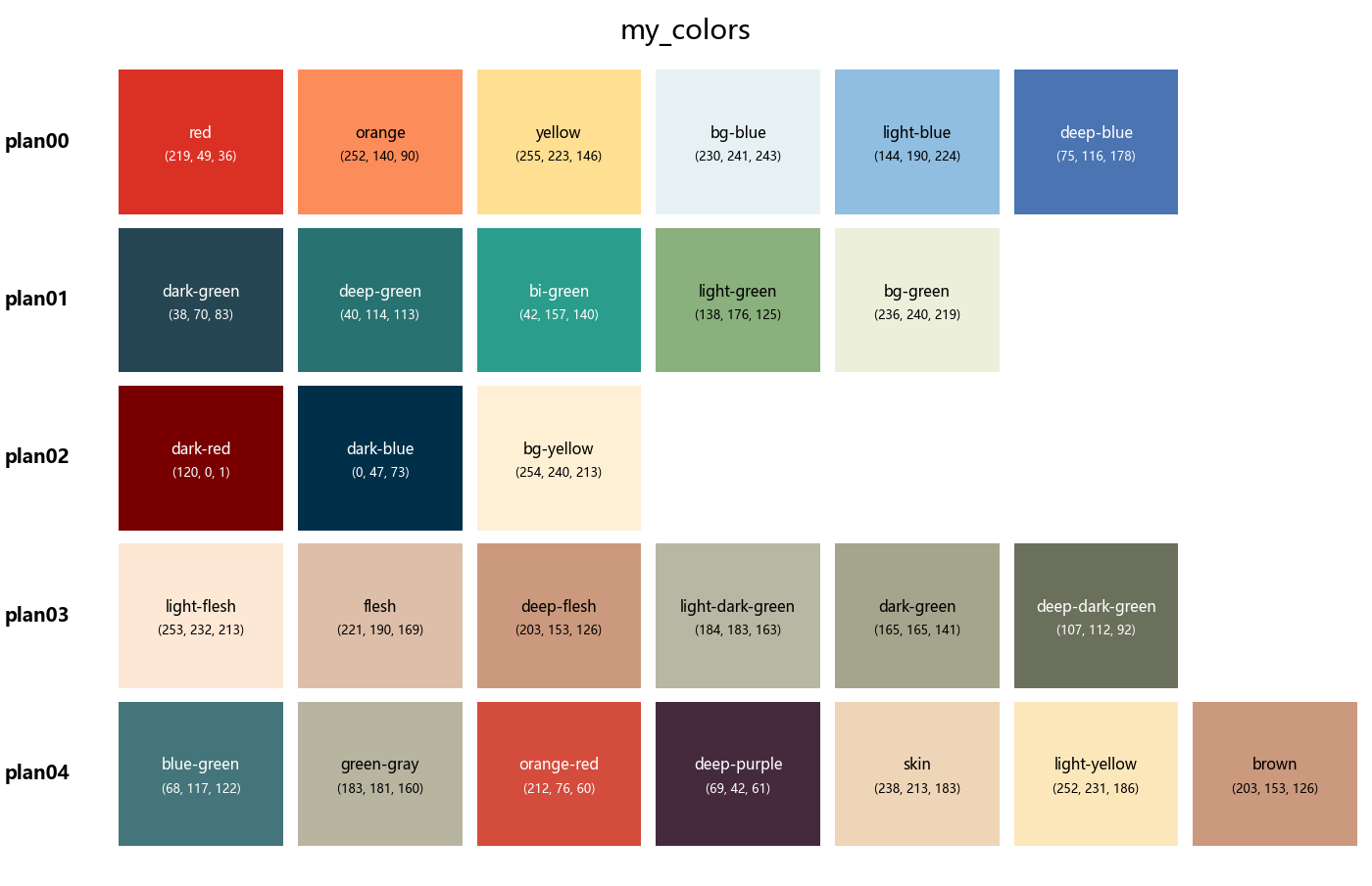 colors = { 'plan00': [ {'name': 'red', 'rgb': [219, 49, 36]}, {'name': 'orange', 'rgb': [252, 140, 90]}, {'name': 'yellow', 'rgb': [255, 223, 146]}, {'name': 'bg-blue', 'rgb': [230, 241, 243]}, {'name': 'light-blue', 'rgb': [144, 190, 224]}, {'name': 'deep-blue', 'rgb': [75, 116, 178]}, ], 'plan01': [ {'name': 'dark-green', 'rgb': [38, 70, 83]}, {'name': 'deep-green', 'rgb': [40, 114, 113]}, {'name': 'bi-green', 'rgb': [42, 157, 140]}, {'name': 'light-green', 'rgb': [138, 176, 125]}, {'name': 'bg-green', 'rgb': [236, 240, 219]}, ], 'plan02': [ {'name': 'dark-red', 'rgb': [120, 0, 1]}, {'name': 'dark-blue', 'rgb': [0, 47, 73]}, {'name': 'bg-yellow', 'rgb': [254, 240, 213]}, ], 'plan03': [ {'name': 'light-flesh', 'rgb': [253, 232, 213]}, {'name': 'flesh', 'rgb':[221, 190, 169]}, {'name': 'deep-flesh', 'rgb': [203, 153, 126]}, {'name': 'light-dark-green', 'rgb': [184, 183, 163]}, {'name': 'dark-green', 'rgb': [165, 165, 141]}, {'name': 'deep-dark-green', 'rgb': [107, 112, 92]}, ], 'plan04': [ {'name': 'blue-green', 'rgb': [68, 117, 122]}, {'name': 'green-gray', 'rgb': [183, 181, 160]}, {'name': 'orange-red', 'rgb': [212, 76, 60]}, {'name': 'deep-purple', 'rgb': [69, 42, 61]}, {'name': 'skin', 'rgb': [238, 213, 183]}, {'name': 'light-yellow', 'rgb': [252, 231, 186]}, {'name': 'brown', 'rgb': [203, 153, 126]}, ] }